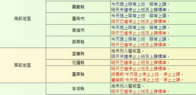 ¨å°åçå課ä¸è¦½è¡¨ - 中南部山區超大豪雨 7日停班停課一覽【更新】 2021/8/6 20:23 (8/7 10:20 更新) 請同意我們的隱私權規範,才能啟用聽新聞的功能。. 屏東枋山鄉、獅子鄉、牡丹鄉、滿州鄉、車城鄉、恆春鎮以及台東縣綠島鄉、蘭嶼鄉8鄉鎮停班停課。 (photo:line today / 鏡週刊) 更多相關整理報導,請往下滑: 你可能也想看 高雄3區屏東3鄉明停班停課 全台其餘縣市正常上班課 新頭殼newtalk | 林序家 綜合報導 發布 2020.05.22 | 23:28 中南部山區超大豪雨 7日停班停課一覽【更新】 2021/8/6 20:23 (8/7 10:20 更新) 請同意我們的隱私權規範,才能啟用聽新聞的功能。 停班停課看這裡 東、屏明停班停課(持續更新) 2016/09/13 11:08 〔即時新聞/綜合報導〕氣象局今天上午8時30分發布強颱莫蘭蒂陸上颱風警報,目前莫蘭蒂以每小時22公里速度,向西北西朝台灣前進,莫蘭蒂目前中心在鵝鑾鼻東南東方海面,向西北西移動,其. 颱風閃電來襲 屏東恆春6鄉鎮、蘭嶼綠島6日停班停課 2020/11/5 21:11 (11/6 00:27 更新) 請同意我們的隱私權規範,才能啟用聽新聞的功能。